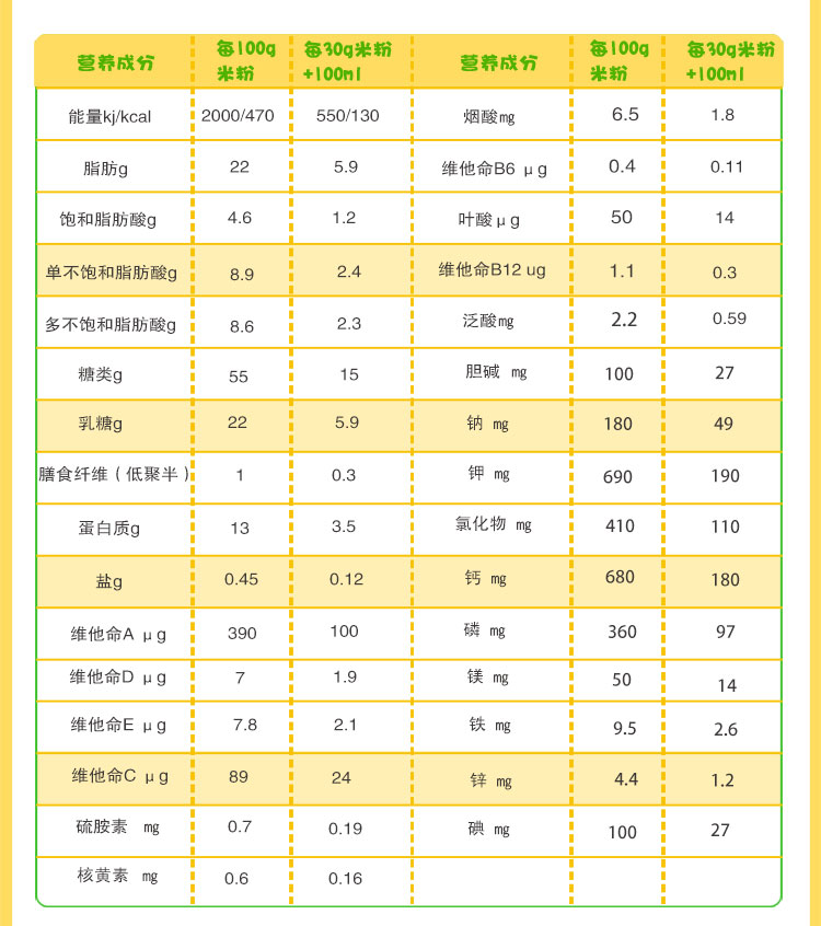 【营养成分】脱脂奶粉、 米粉 、燕麦粉 、植物油浓缩苹果汁(15%)、 梨浓缩汁(4.5%)、牛奶蛋白质 、矿物质(钙 铁 锌 碘)、乳化剂 、乳酸益生菌 、维生素(A D E C)、硫胺素、 烟酸B6、叶酸B12 B5.